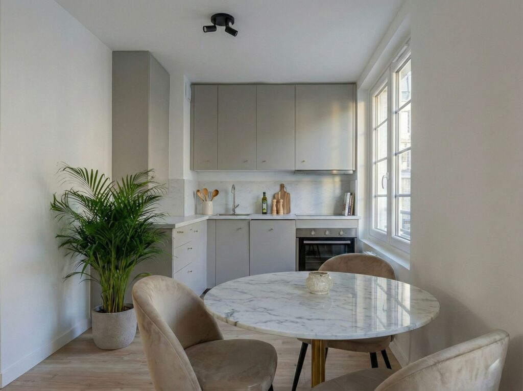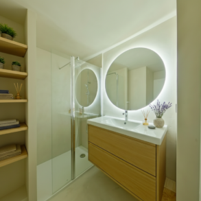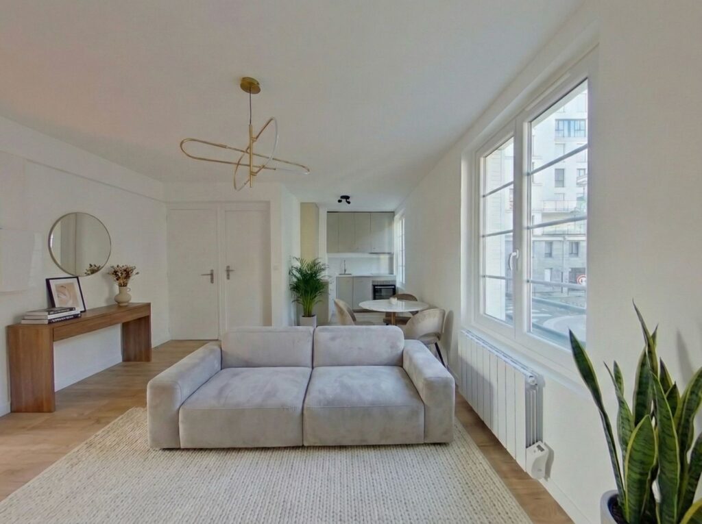 Rénovation de qualité avec matériaux sobres et élégants, cuisine moderne, salle d'eau effet béton ciré, receveur extra plat.