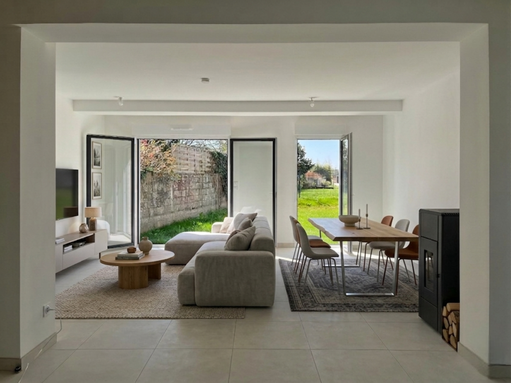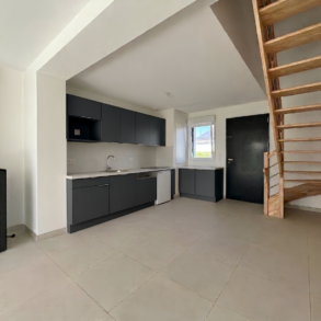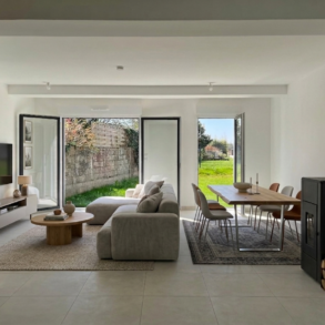 La maison de 82 m2 se compose d'un salon/séjour avec cuisine ouverte d'une superficie de 40 m2, traversant, qui est prolongé par le jardin de 52m2 exposé Sud-Ouest.