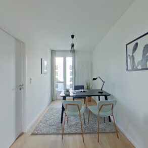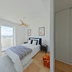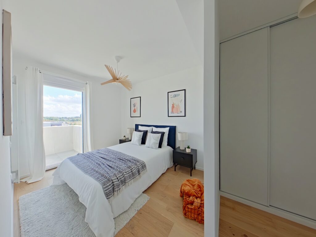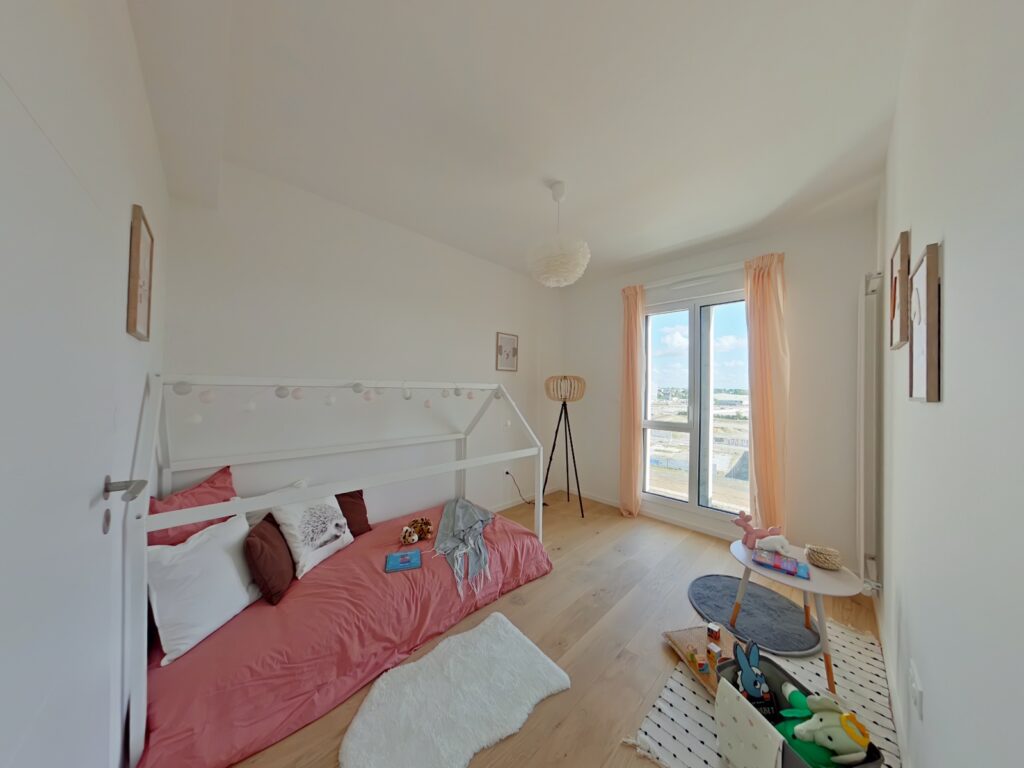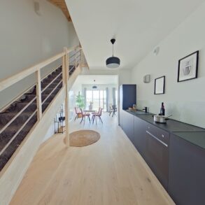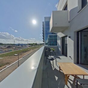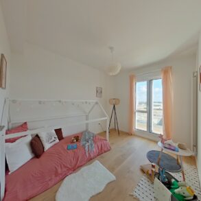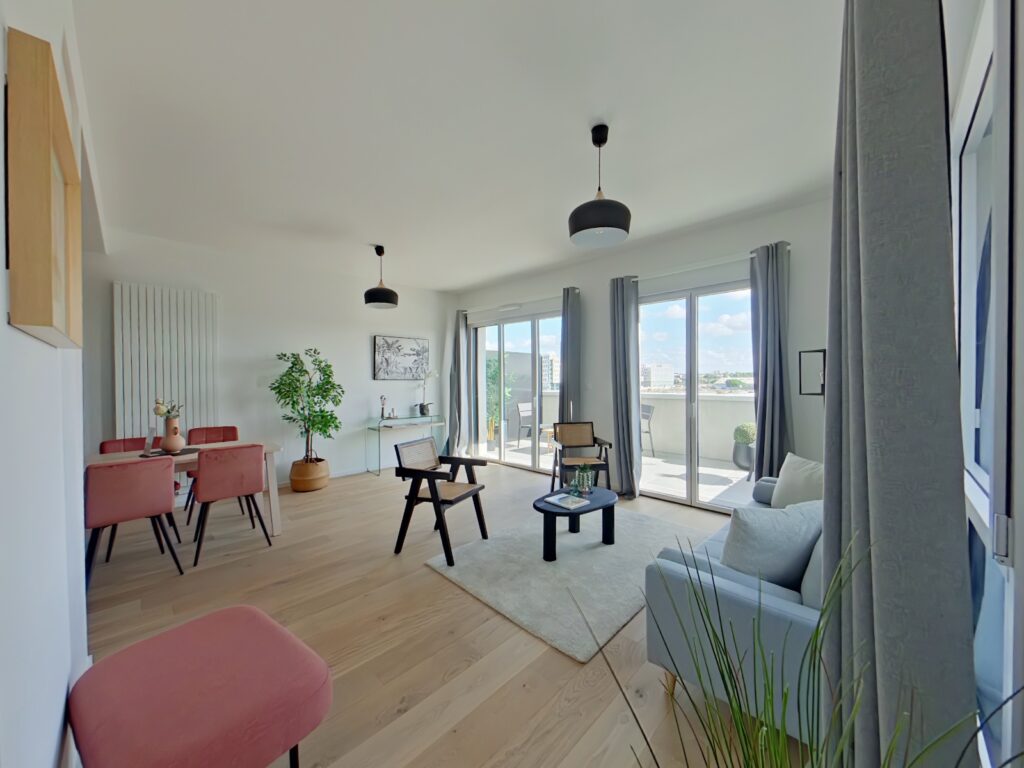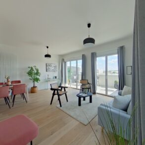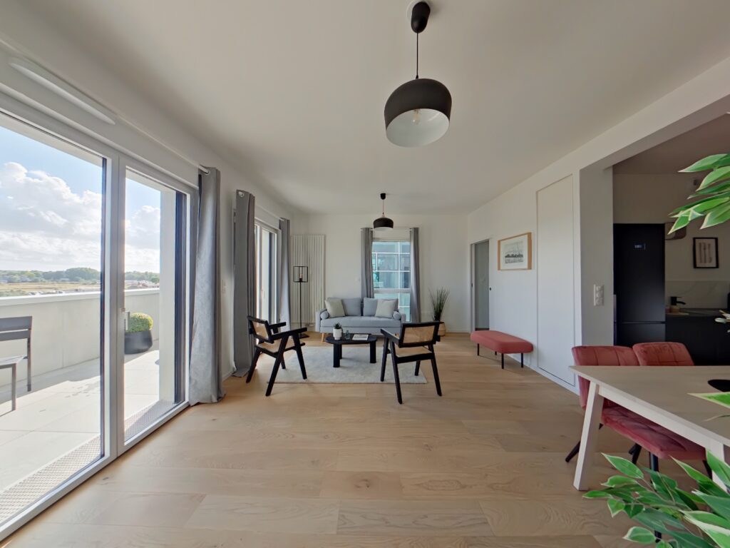 Pièce principale de 46 m2 cuisine et entrée comprises. Salon exposée plein Sud prolongée par un balcon de 12 m2, à la vue dominante sur les futurs Jardins de l'Estuaire.