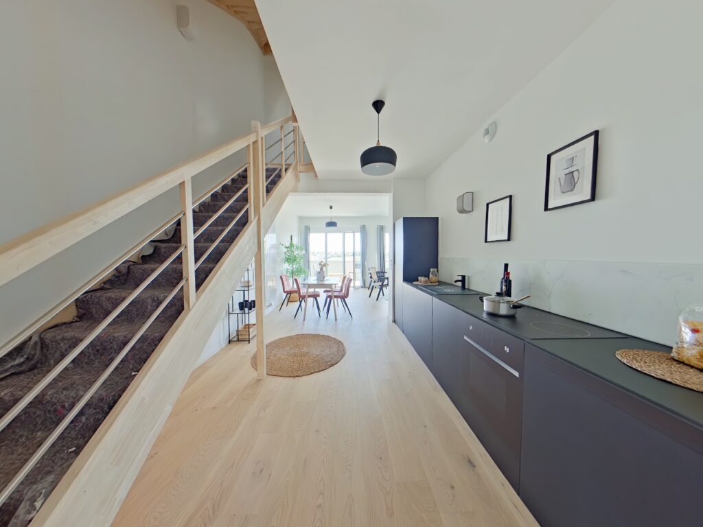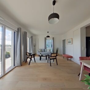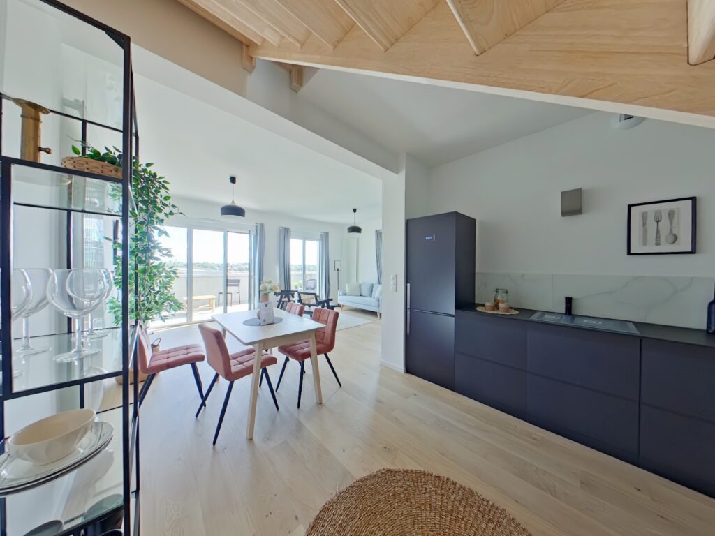 Situation Privilégiée, entre les machines de l'île et les futurs jardins de l'Estuaire, au dernier étage d'une copropriété de standing appartement T5 aux prestations de standing de 128 m2 prolongé par un total de 53 m2.