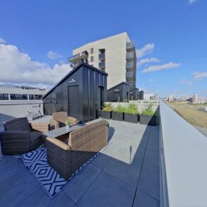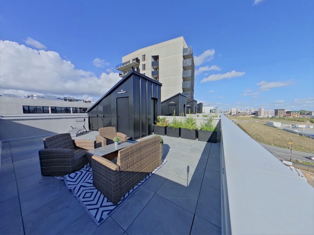 Au deuxième étage se trouve le toit terrasse de 36 m2 placards de rangements extérieurs compris.