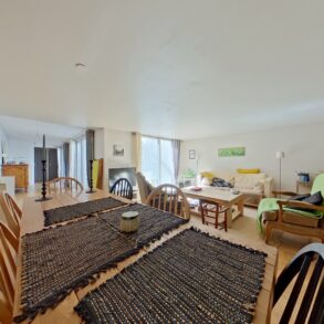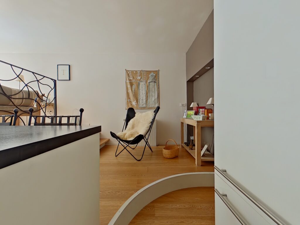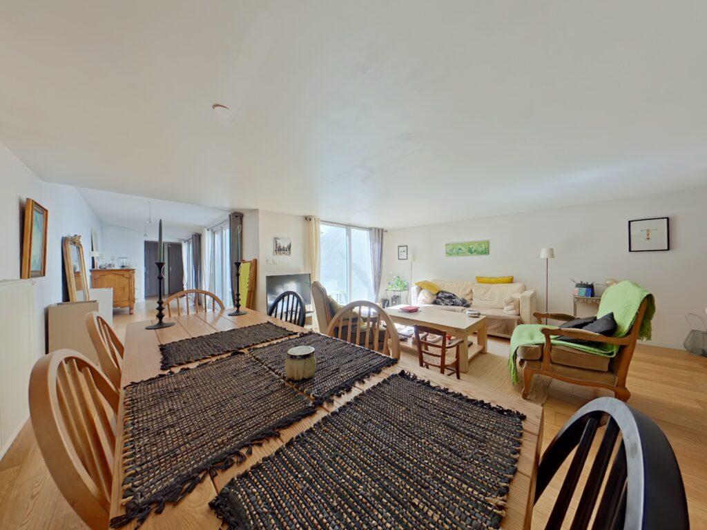 Le salon/séjour en demi niveau, sur parquet, dispose d'une superficie de 24 m2 bénéficie d'une exposition Sud et est prolongé par une pièce ouverte de 13 m2. L'ensemble permet d'accéder au patio exposé Sud et Ouest de 18 m2.