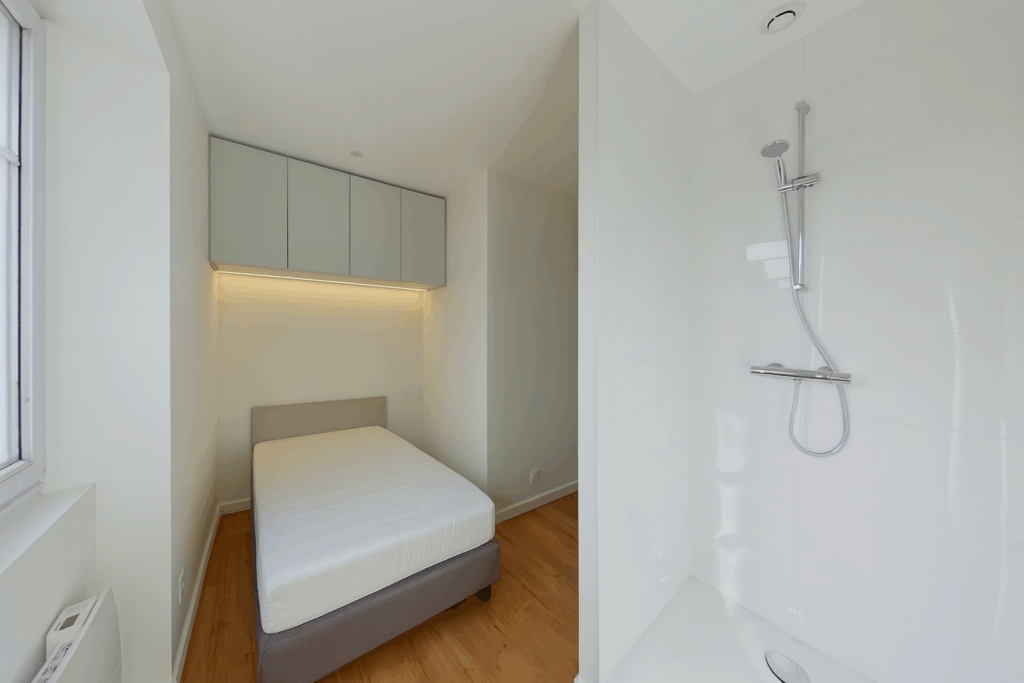L'appartement situé au 4e étage au calme complet sur cour, se compose d'une entrée desservant la pièce principale d'une superficie de 25 m2 avec cuisine aménagée et équipée. Une chambre de 8,5 m2 avec salle d'eau et wc.
