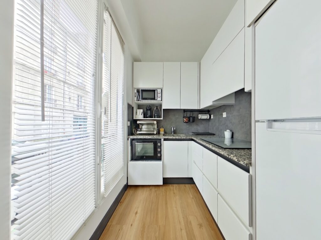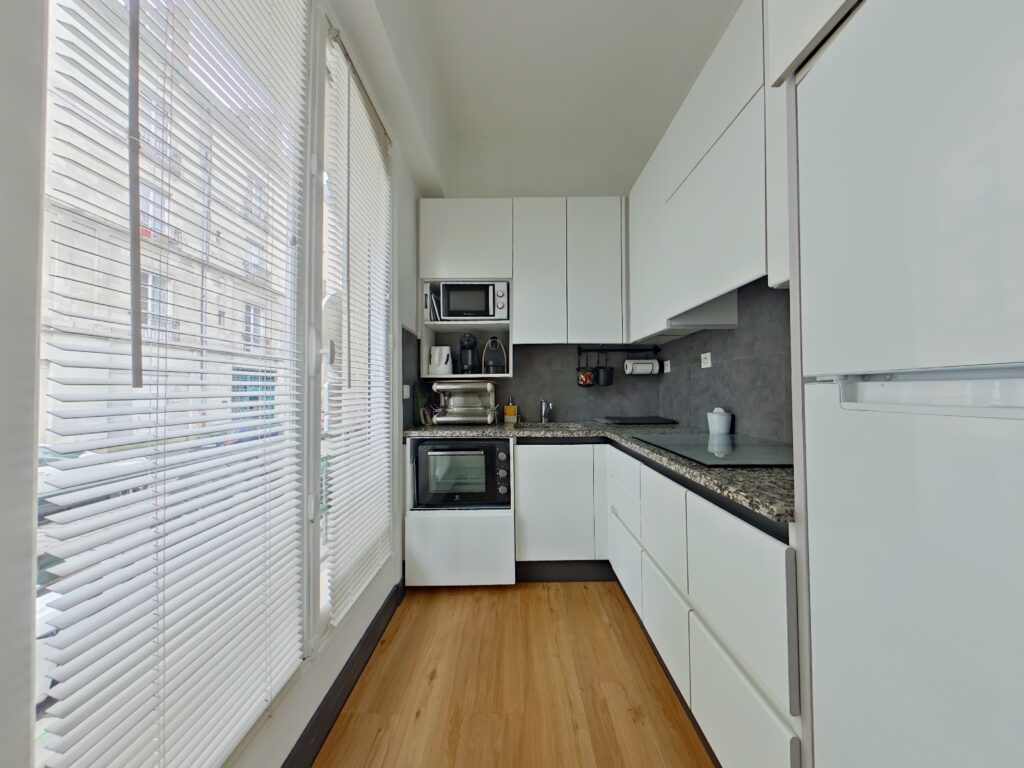 La cuisine, indépendante, communique avec la pièce de vie.