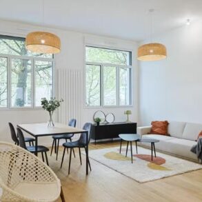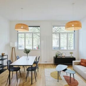 Séjour/Cuisine de 33 m2, baignée de lumière. Coin salon/bureau séparé de 11m2 communiquant sur la terrasse.