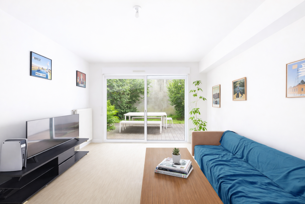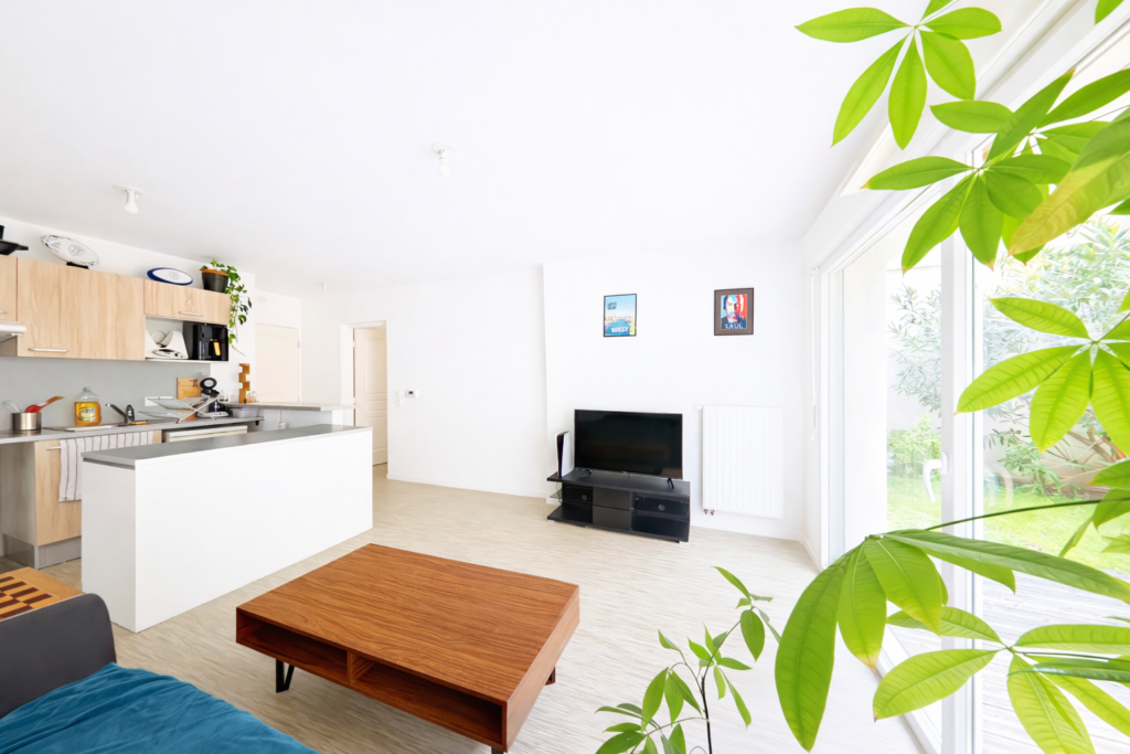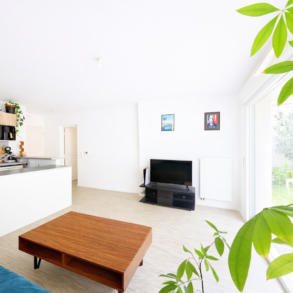 L’appartement se compose d’une belle pièce de vie avec cuisine ouverte, baignée de lumière grâce à une large baie vitrée donnant directement accès à un jardin privatif avec terrasse en bois. Cet espace extérieur est idéal pour profiter des beaux jours, recevoir ou simplement se détendre dans un environnement calme.